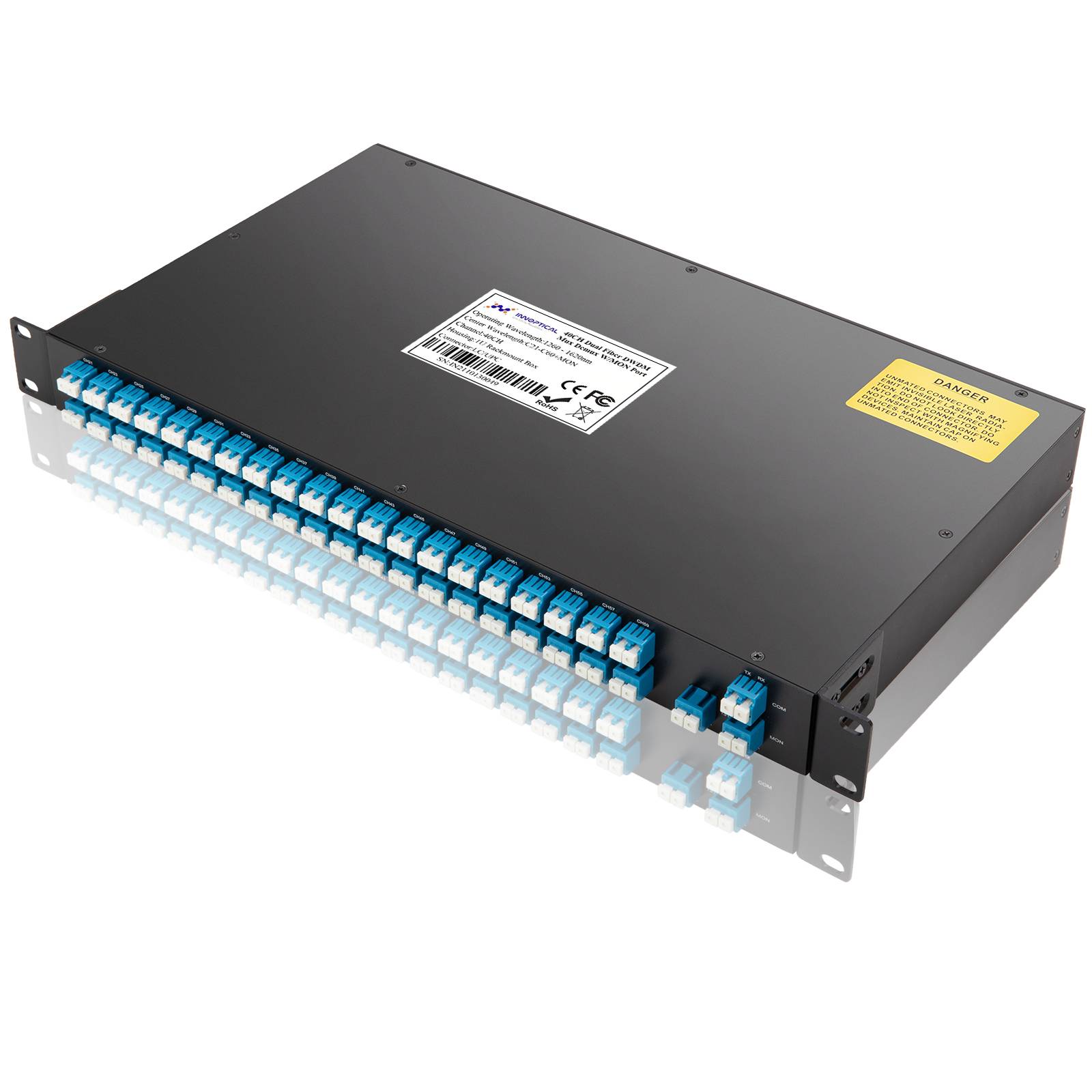 Innptical’s IN-CWDM-CHxx-1RU CWDM technology uses ITU standard 20nm spacing between the wavelengths, from 1270nm to 1610nm. Our CWDM module has 2 to 18 channels. The central wavelength of each channel is specified to one of the ITU-T grid wavelengths. The CWDM module features wide channel bandwidth (13nm). Its isolation is greater than 30dB for adjacent channels, and greater than 40dB for non-adjacent channels. The module also has high thermal stability to ensure reliable performance under different environment.